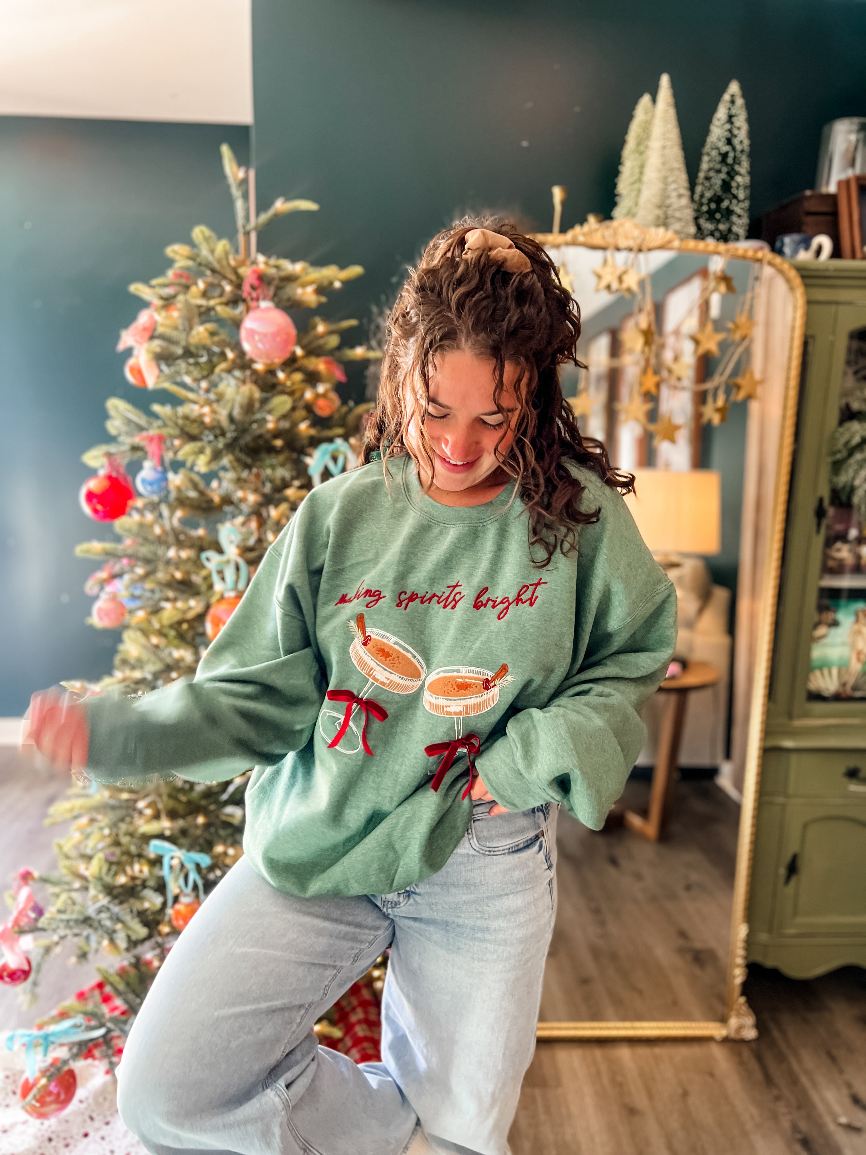 This cozy sweatshirt features beautifully embroidered champagne glasses, each topped with a real, hand-tied bow for the perfect touch of texture and charm. Finished with the festive phrase “Making Spirits Bright,” this design brings sparkle and cheer to any celebration.
