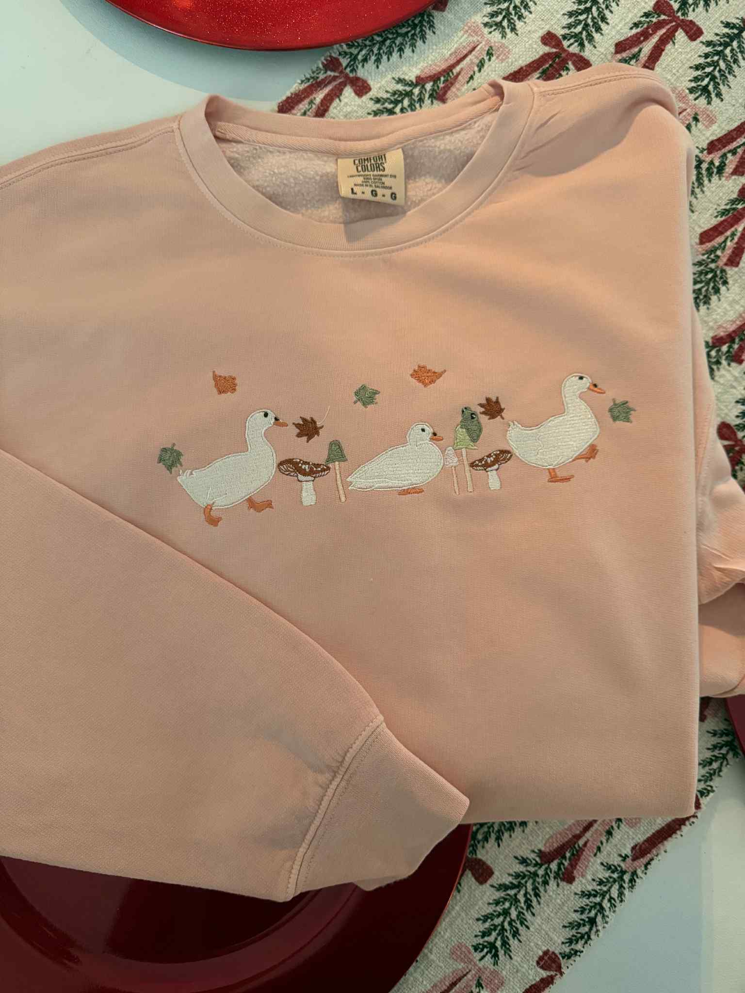 Step into cozy fall charm with our Autumn Duck Parade embroidered shirt! 🦆🍂 Three sweet little ducks march across the chest, surrounded by tumbling autumn leaves, whimsical mushrooms, and the cutest tiny frog tagging along for the adventure.