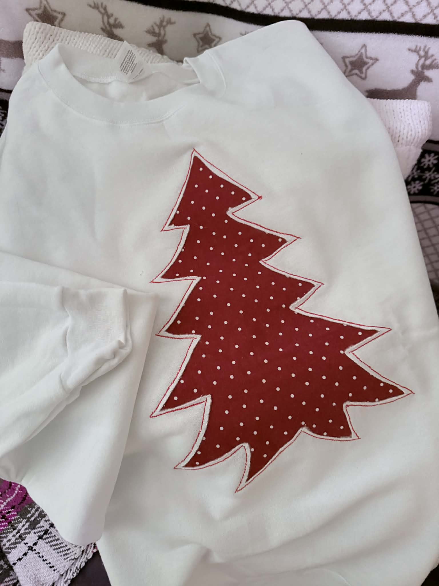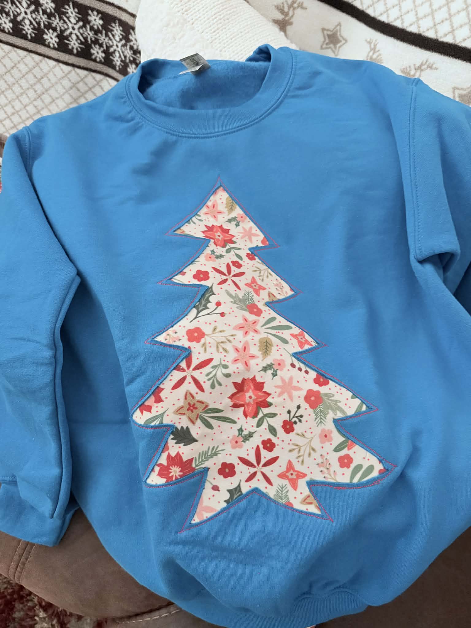 These Christmas Trees are done in reverse applique - the front of the sweatshirt is cut out revealing these cute fabrics!  We have 2 available and both are Ready to Ship!