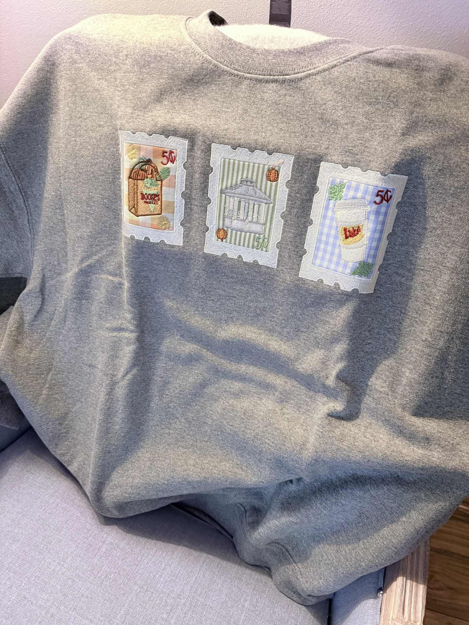 Step into the cozy charm of Stars Hollow with this beautifully embroidered top featuring three iconic "stamps." The first stamp showcases a Doose's Market shopping bag overflowing with festive pumpkins, the second captures the beloved town gazebo in intricate detail, and the third features the must-have to-go coffee cup from Luke's Diner. This one is done on an XLarge Unisex Traditional Sweatshirt in Graphite and is Ready to Ship!