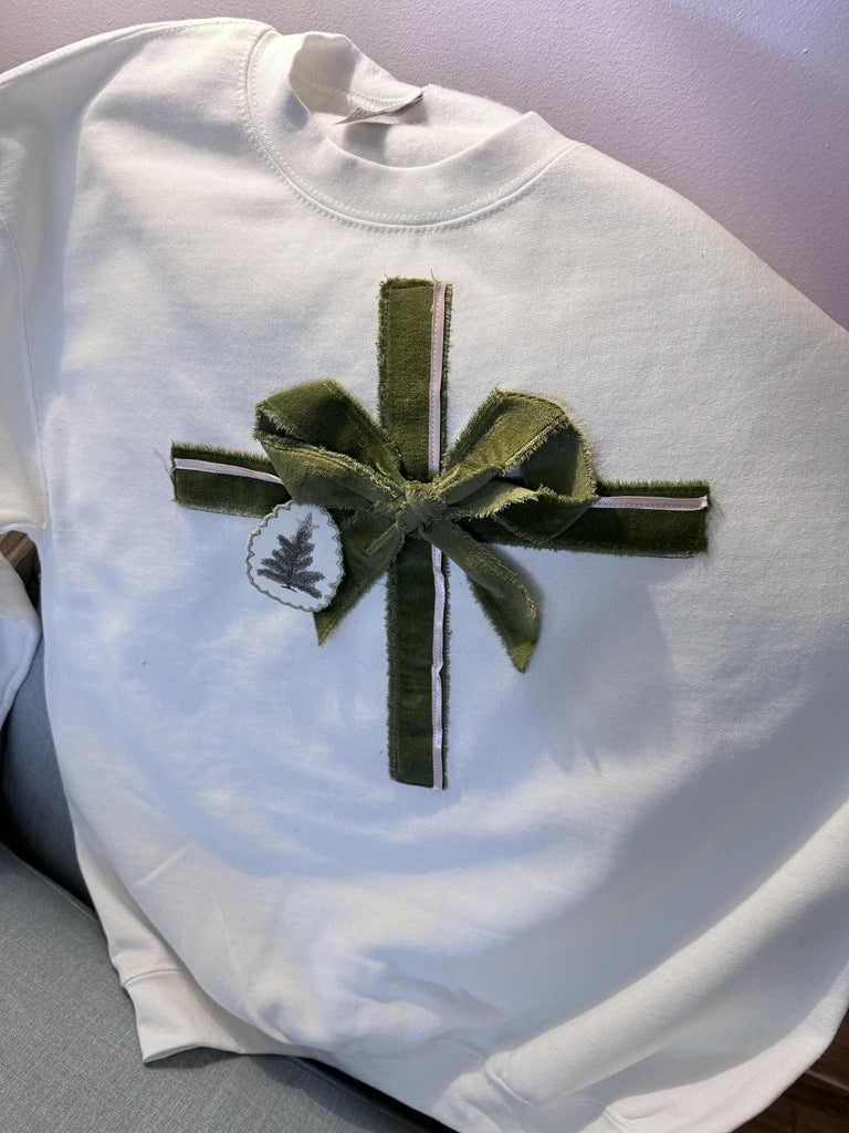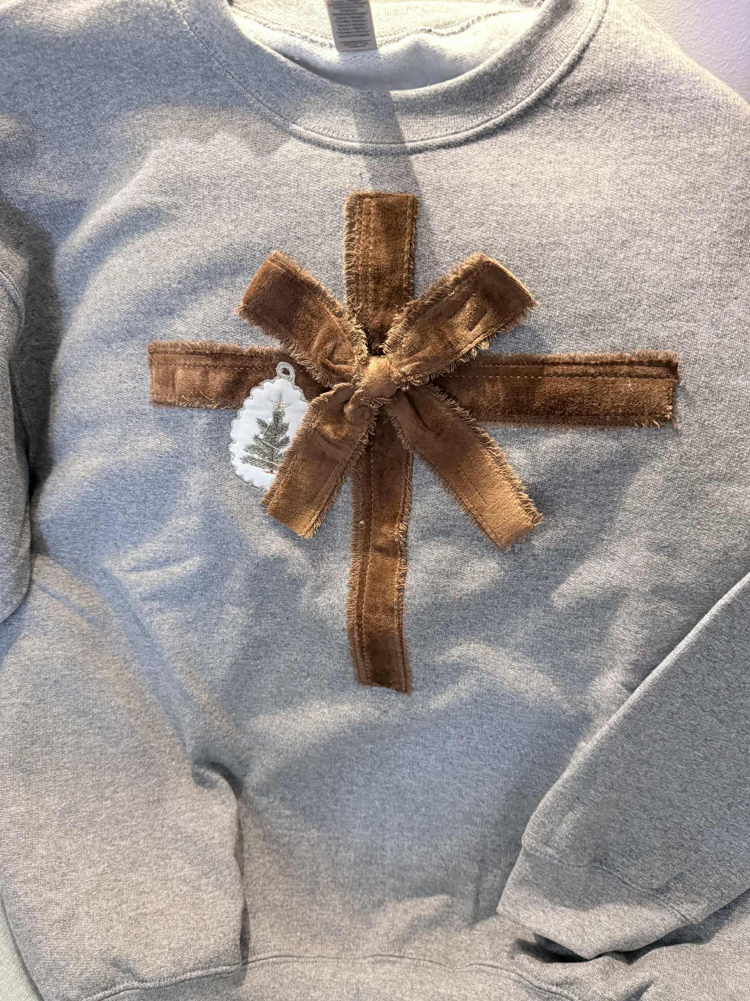 Wrap yourself in holiday charm with this ash-colored Hanes EcoSmart  Traditional Sweatshirt, featuring a beautifully embroidered velvet ribbon bow on the chest — complete with a festive embroidered gift tag for that “wrapped like a present” feel.