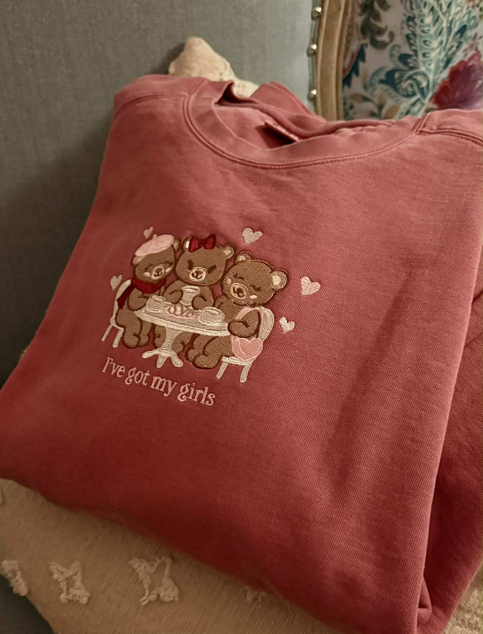Wrap yourself in comfort and charm with our I've Got My Girls Embroidered Pullover, featuring an original design created in-house and stitched with care. This sweet scene showcases three teddy bears gathered together, surrounded by delicate heart details and finished with the phrase “I’ve got my girls”—a heartfelt nod to friendship, sisterhood, and love.
