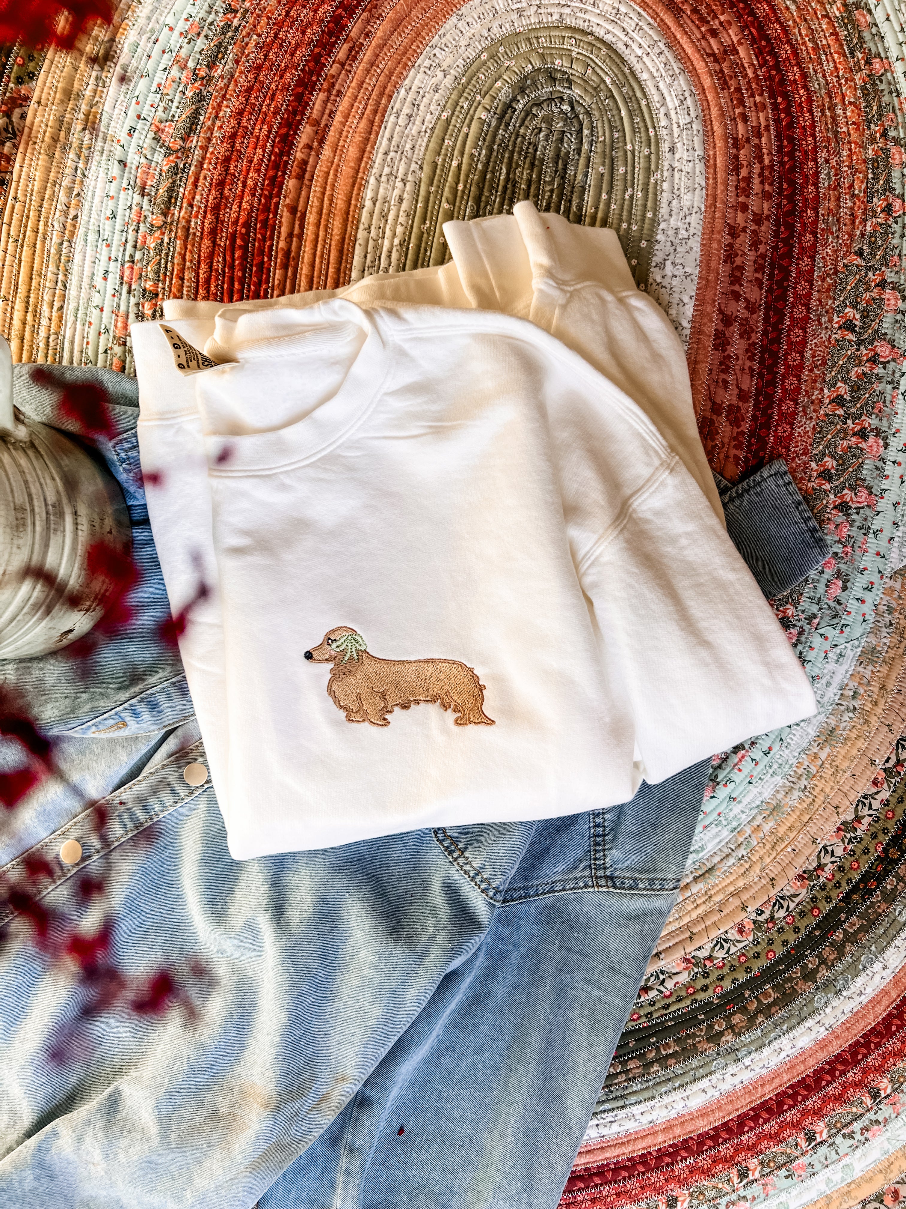 On the front pocket area, you’ll find a coordinating embroidered weenie dog for a subtle, classic look from the front — with the full statement moment when you turn around.