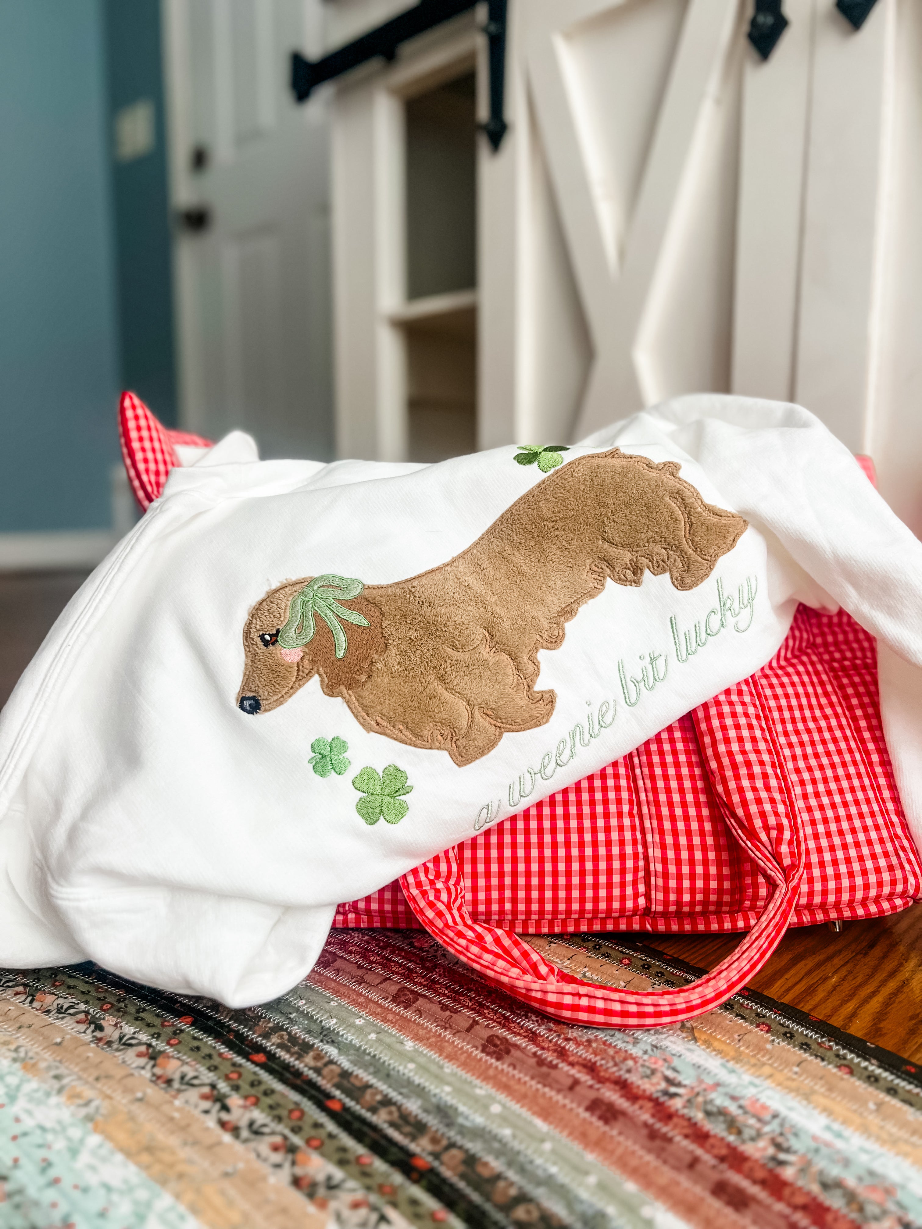 This one is for the dachshund lovers our “A Weenie Bit Lucky” design features the cutest weenie dog appliqué on the back, stitched in soft terry cloth fabric for the sweetest textured detail. The playful phrase adds the perfect festive touch for St. Patrick’s Day.